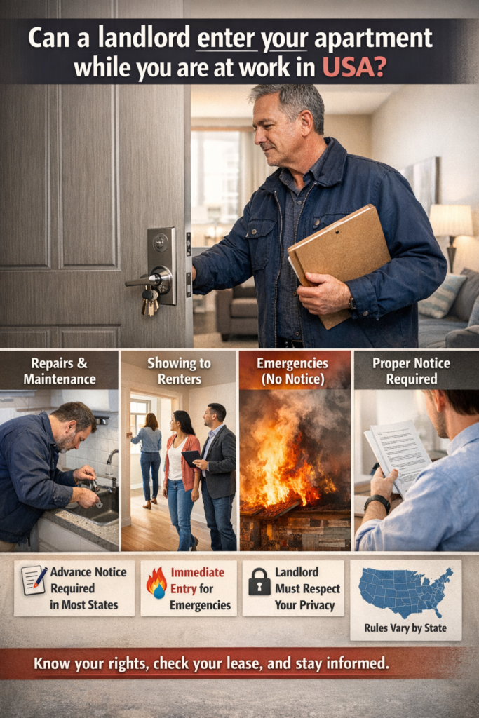 In most cases, yes, a landlord can enter your apartment while you are at work in USA, but only if certain rules are followed. They usually need a valid reason and must give proper notice before entering, even if you are not home.